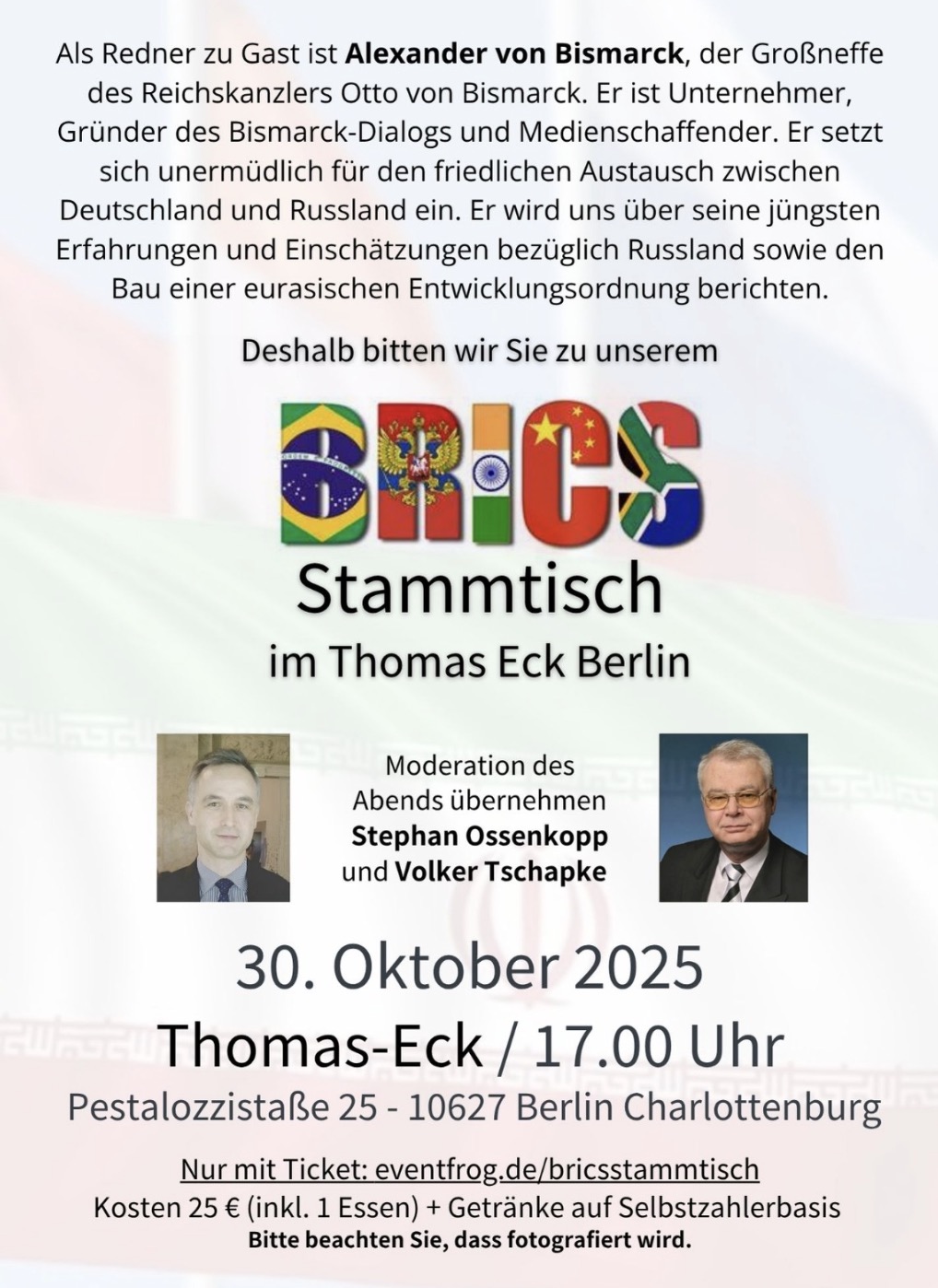 BRICS Stammtisch 30Oct.2025 Joined Pay Now Not Going Buy Ticket Share Tweet Categorised in: Veranstaltungen
