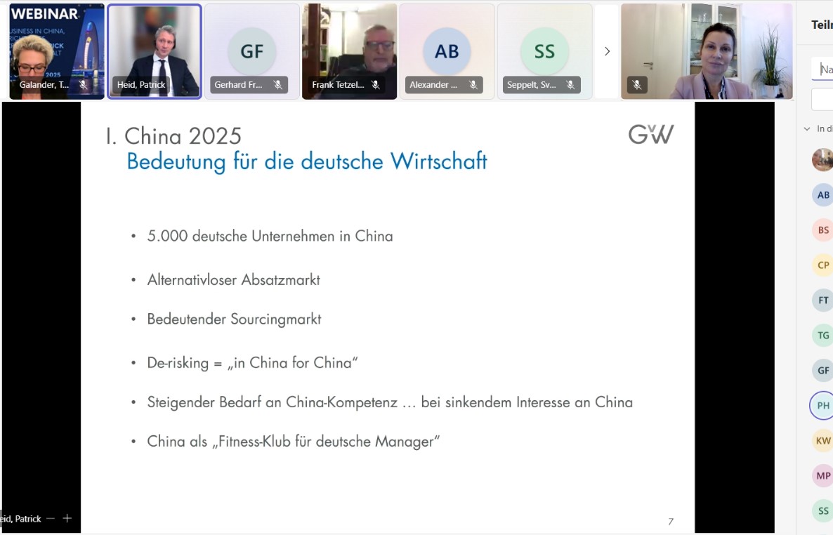 Patrick Heid gibt in diesem Webinar einen aktuellen Überblick über die daraus resultierenden Herausforderungen, die Potenziale und Risiken eines Engagements im chinesischen Markt.